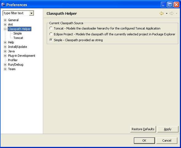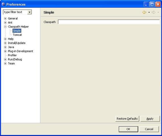 After defining the preference page in our plugin, we should have a page similar to the follow: Note how this page is accessible off of the Classpath Helper area.